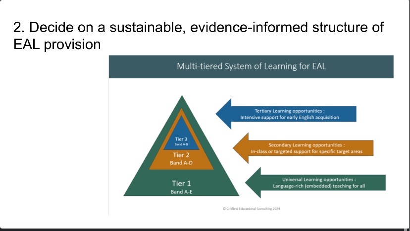 EAL-specific assessment tools help to establish the level of provision needed for certain learners. Crisfield’s Tiers are aligned to the Bell Framework for Assessment, which is my preferred assessment tool, but I am familiar with WIDA. While assessment using the Bell Framework would ideally be the responsibility of all teachers, in my experience, it would typically be the responsibility of the EAL team.