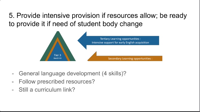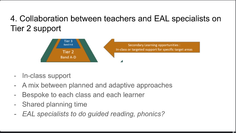 Collaboration between EAL teachers and classroom lead teachers is important or ensuring Tier 2 provision meets the specific needs of the learners – shared planning time can help with this.