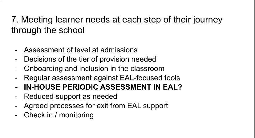 The Bell Assessment is great for formative assessment, but it lacks an initial screener and period assessment tools. The role of the EAL team may be to create such as periodic assessments to ensure decisions on exits are informed.