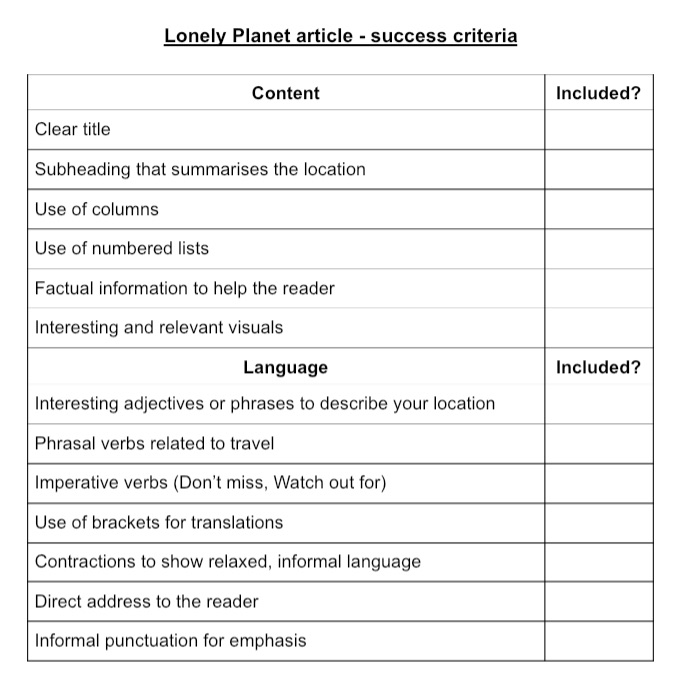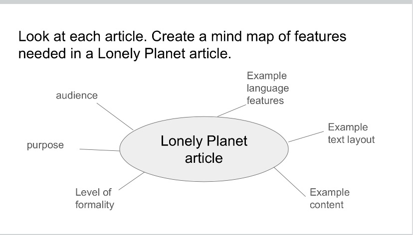 We’d been studying Lonely Planet guides, with a view to learners writing their own guidebook page in that style. Great authentic focus. Learners had access to plenty of example pages from the LP and we analysed the typical features of these. However, I felt like some of my EAL learners would benefit from having a less busy example of target features. This is a tricky one, as I’m usually a ‘adapt the task not the text’ type teacher. I made a different judgement call here though.
