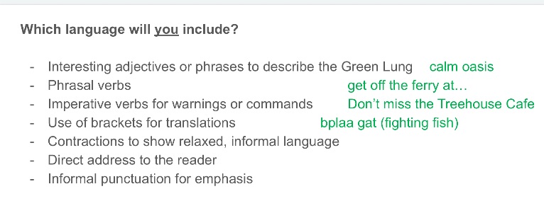 We used the same questions about the Green Lung as a talk-for-writing, where learners spoke about their own tourist attraction in Thailand. Then we prepped ideas for language to include in our own guides: