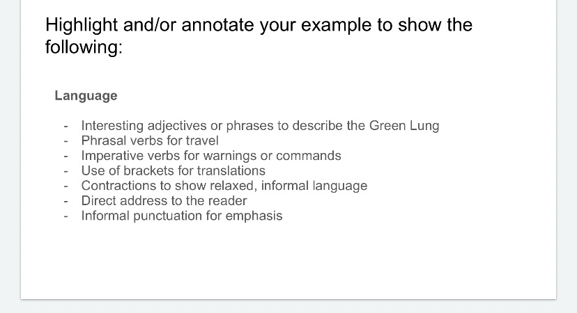 This was my first-page WAGOLL. I purposefully avoided the more factfiley boxes in this model (things like opening times, etc) and went more for target language to use in the body paragraphs. There had already been some pre-teaching of target language, like phrasal verbs, imperatives, etc, so then we identified examples in the Green Lung text. These included: