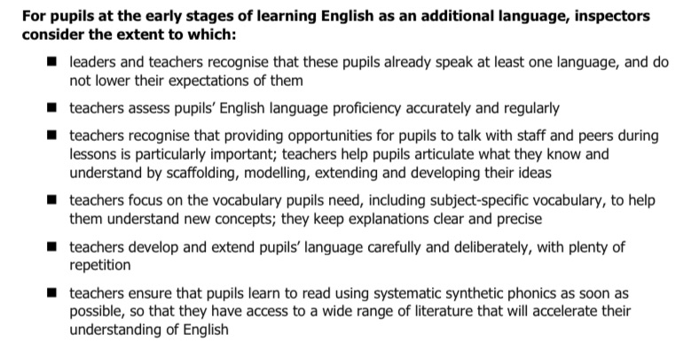 There are plenty of audits/inspections at international schools: ISQM, BSO, COBIS, etc. They are valuable quality assurance marks, and many look for some kind of alignment to/‘best practice’ in delivering the English National Curriculum. Updates to state-funded inspection criteria in England (Ofsted) get factored into current inspections, and the latest changes show that EAL is finally on the radar!
