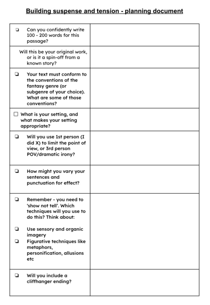 Next was more structured planning. I’d looked at the lesson content throughout the unit and added the features of fantasy writing that we’d analysed into tangible planning docs.