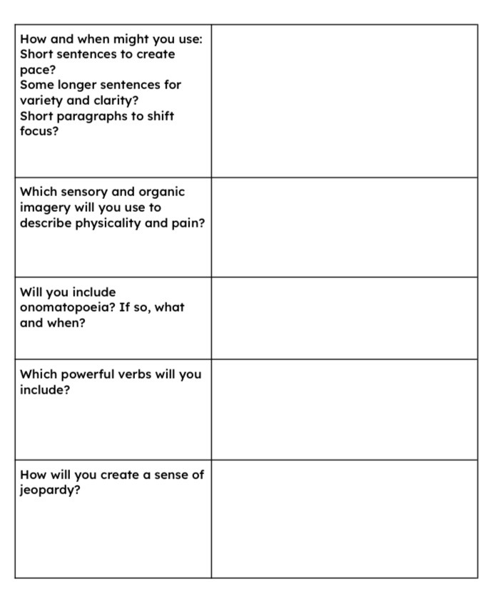 This was a short planning phase, more just ideas generation for 10 minutes. What I was most interested in was the ideas that jumped out to learners. I wanted to see who was linking ideas from the unit into their own planning – *relevant* to the extract chosen. For example, we’d spoken about the use of ‘violent verbs’ in actions scenes, short sentences as awesome lead-ins for quickfire action (eg fight scenes), etc. This ideas drop was more of a diagnostic. I identified 3 learners to monitor more closely leading up to the task, as they weren’t really linking content and language features to their chosen passsge.