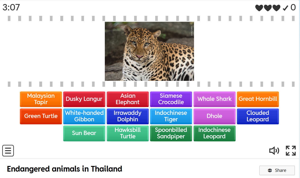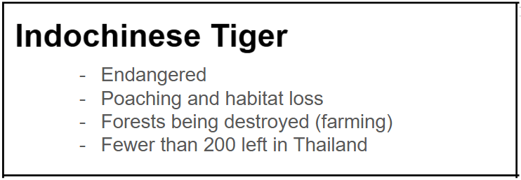 Objective: introduce/review key terms related to conservation; raise awareness of threats to wildlife in Thailand.