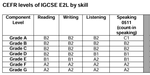 – If learners are studying towards a qualification like IGCSE ESL, the mapping of course grades against CEFR clearly demonstrates that learning is expected to slow as challenge increases. In the example below, one-grade increases in Reading from F-D cover A2-B2 levels, then Grades D-A demonstrates various levels of competence working within B2.